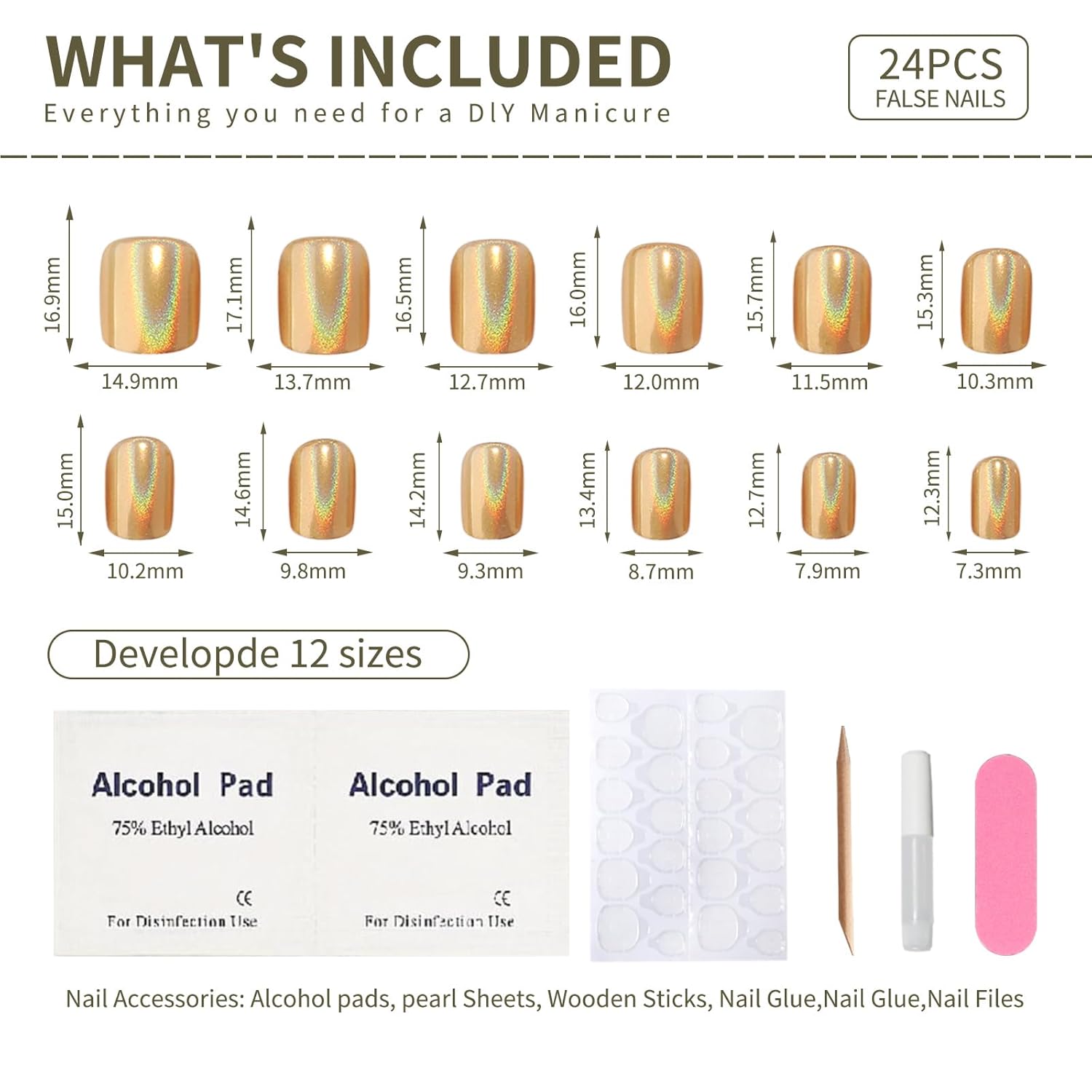 - Package Includes: 24 pcs stick on false glue on nails kit, each box includes 24 square press on nails, 1 sheet of 24 sticky nail pieces, 1 cuticle stick, 1 double sided nail file and gel press on nails cleaning pads, a small tube of nail glue,All the tools you need to apply the nails are included in one set