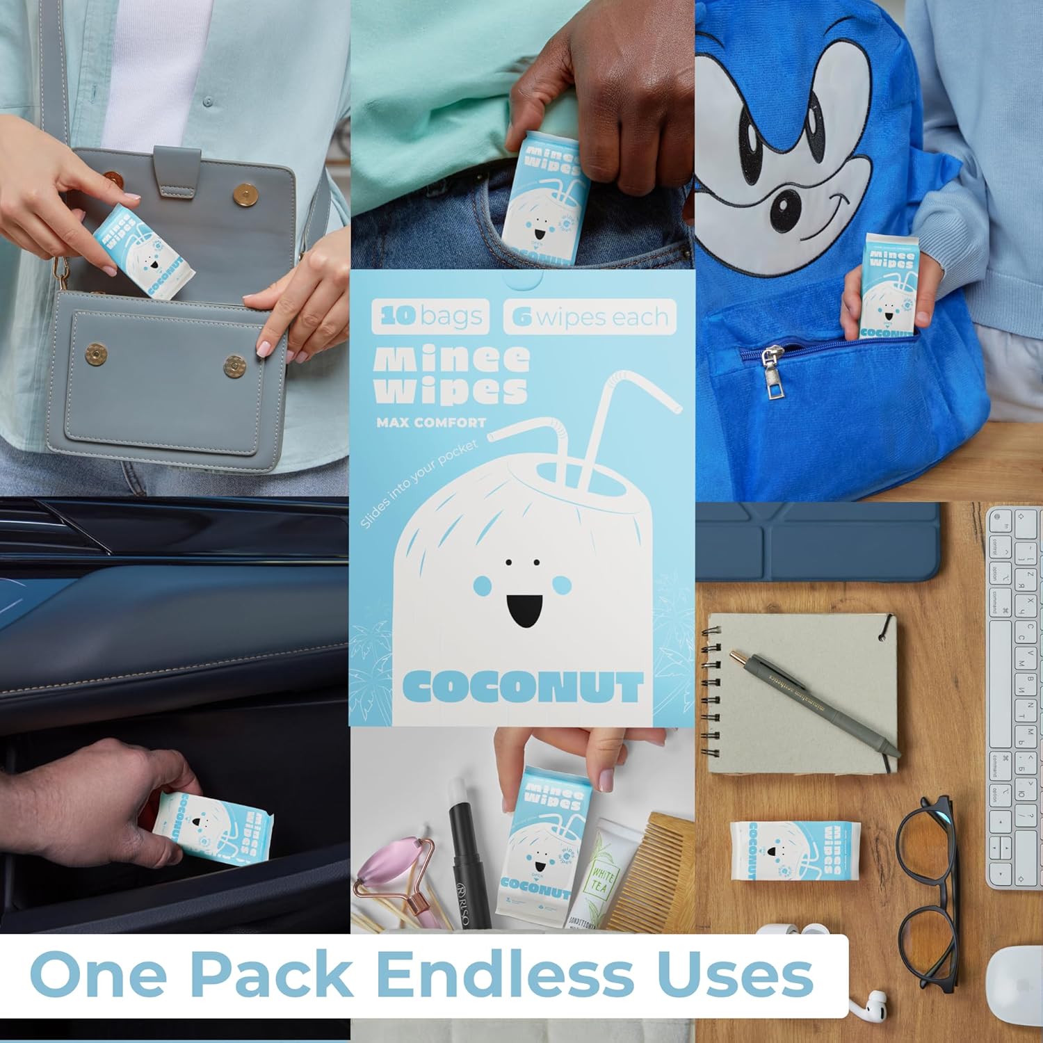 - 💙SLIDES INTO YOUR POCKET: Our mini coconut wipes offer the ultimate in portability with their compact design. These refreshing scented wipes fit effortlessly into your pocket, making them the ideal choice for those seeking convenient, on-the-go hygiene solutions. Perfect coconut hand wipes for any occasion. More convenient to use than individual wipes and hand wipes individually wrapped.