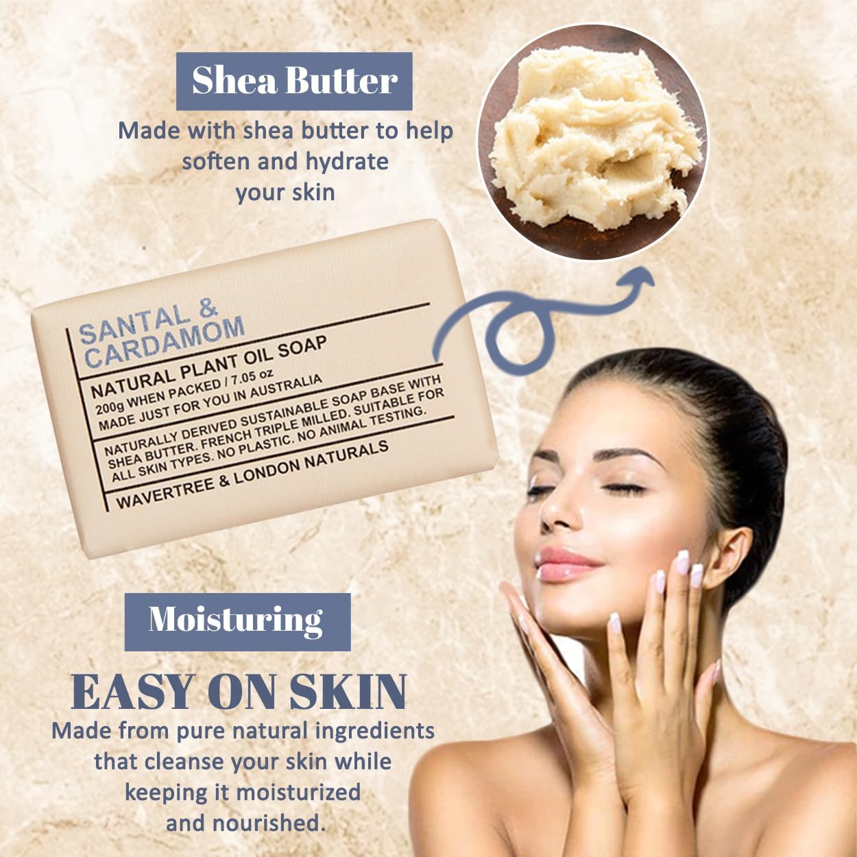 Wavertree & London Santal & Cardamon Scented 100% Natural Soap Bar, 7oz Moisturizing French Triple Milled Soap Bar for Women & Men enriched with shea butter - Pure Bath & Body soap bar
