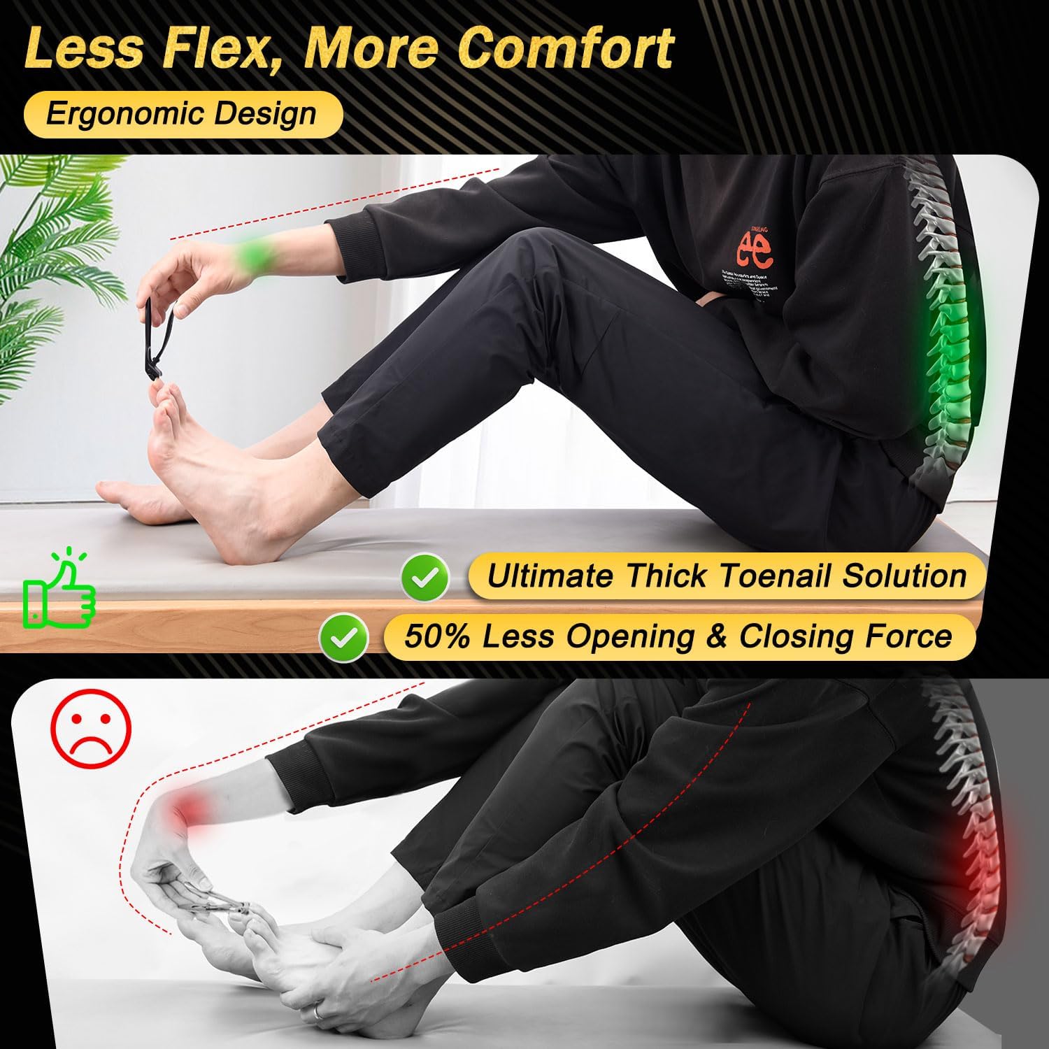 - Angled Head & Anti-Splash Design: This toenail clippers for thick toenails adopts an innovative curved blade design, so you don't need to bend over when trimming your toenails. The ergonomically designed non-slip handle not only provides you with a comfortable grip, but also effectively prevents it from slipping from your hands, providing safe and reliable trimming. This thick toenail clippers also has a thoughtful design for nail storage, which can effectively prevent toenails splatter, and you don't need to spend time on cleaning.
