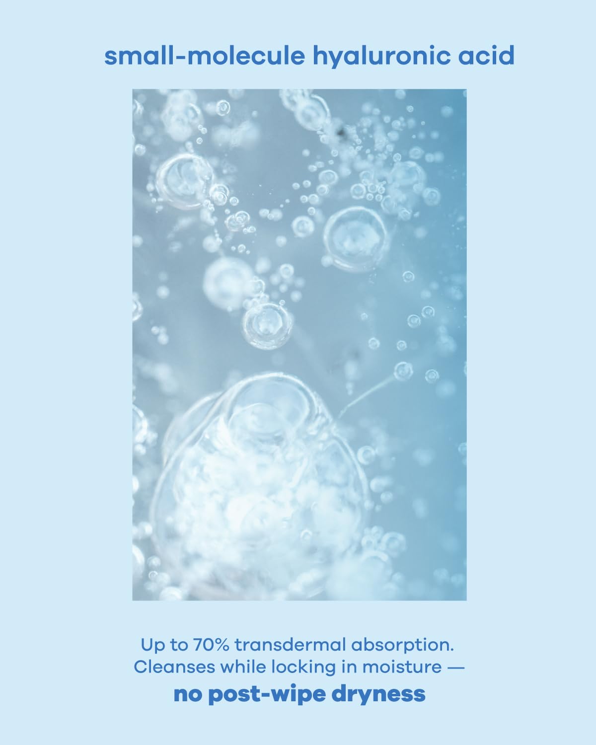 - Hydrating and Gentle:Infused with small-molecule hyaluronic acid that penetrates deeply, providing up to 70% transdermal absorption. Cleanses while locking in moisture — no post-wipe dryness.