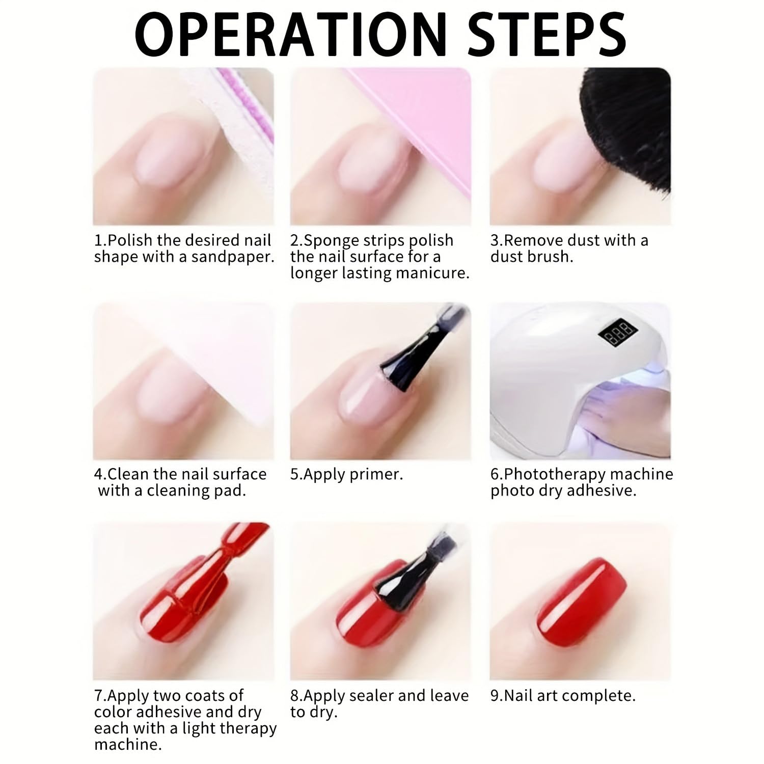 - Widely Applicable: Base coat suitable for home or salon; 30-120 seconds fast drying nail polish, detailed guide attached.Note: Nail glue should be used with nail lamp, and the effect is better if you follow the steps.
