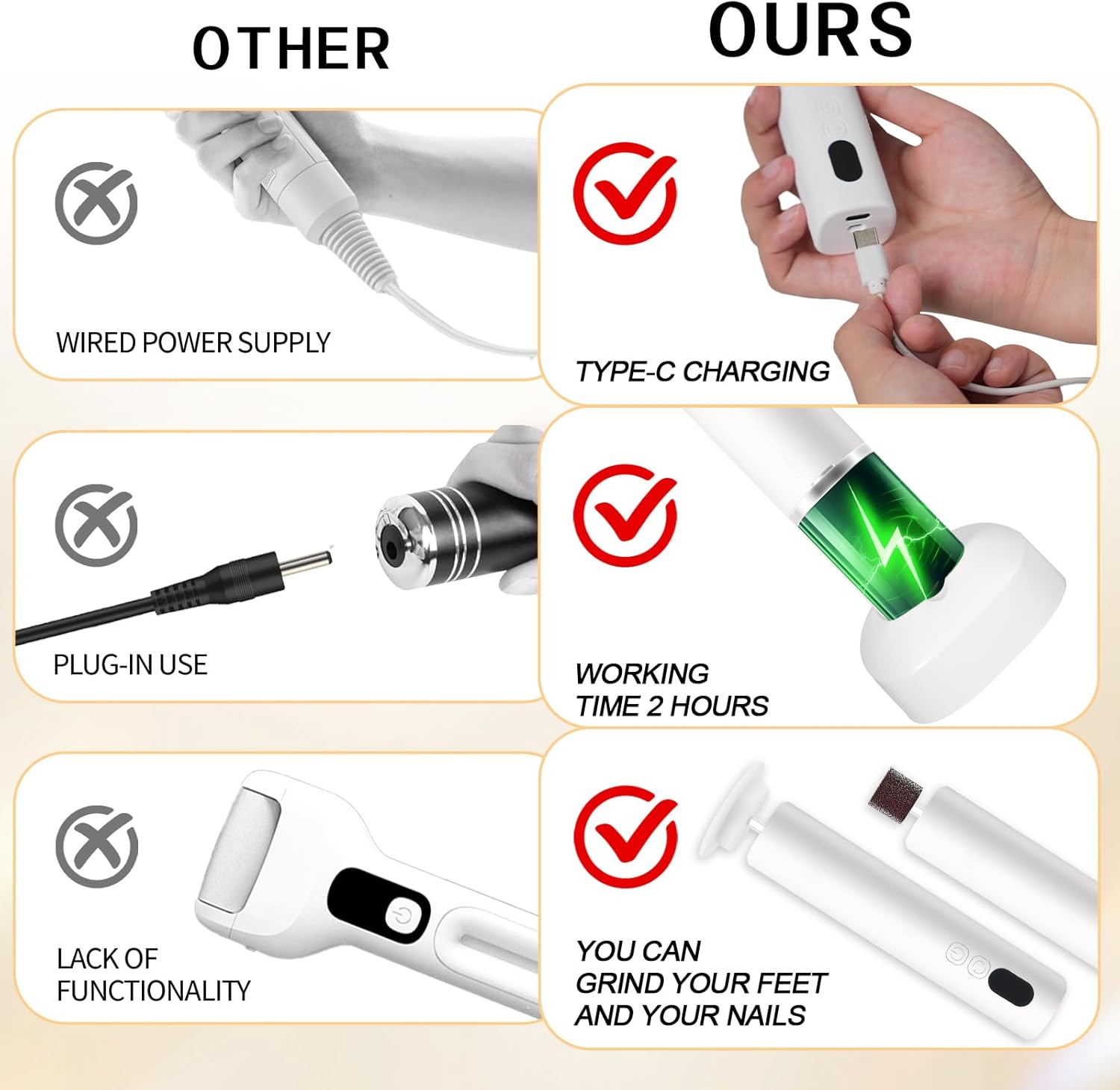 - 【Professional Smoothness in Minutes】Say goodbye to rough feet! Our 360° rotating electric callus remover delivers professional-level smoothness with its high-performance grinding head. It works like magic to effortlessly remove thick calluses and dead skin—no more soreness from manual scrubbing. Perfect for at-home spa sessions or as a gift for busy moms, travelers, or self-care enthusiasts