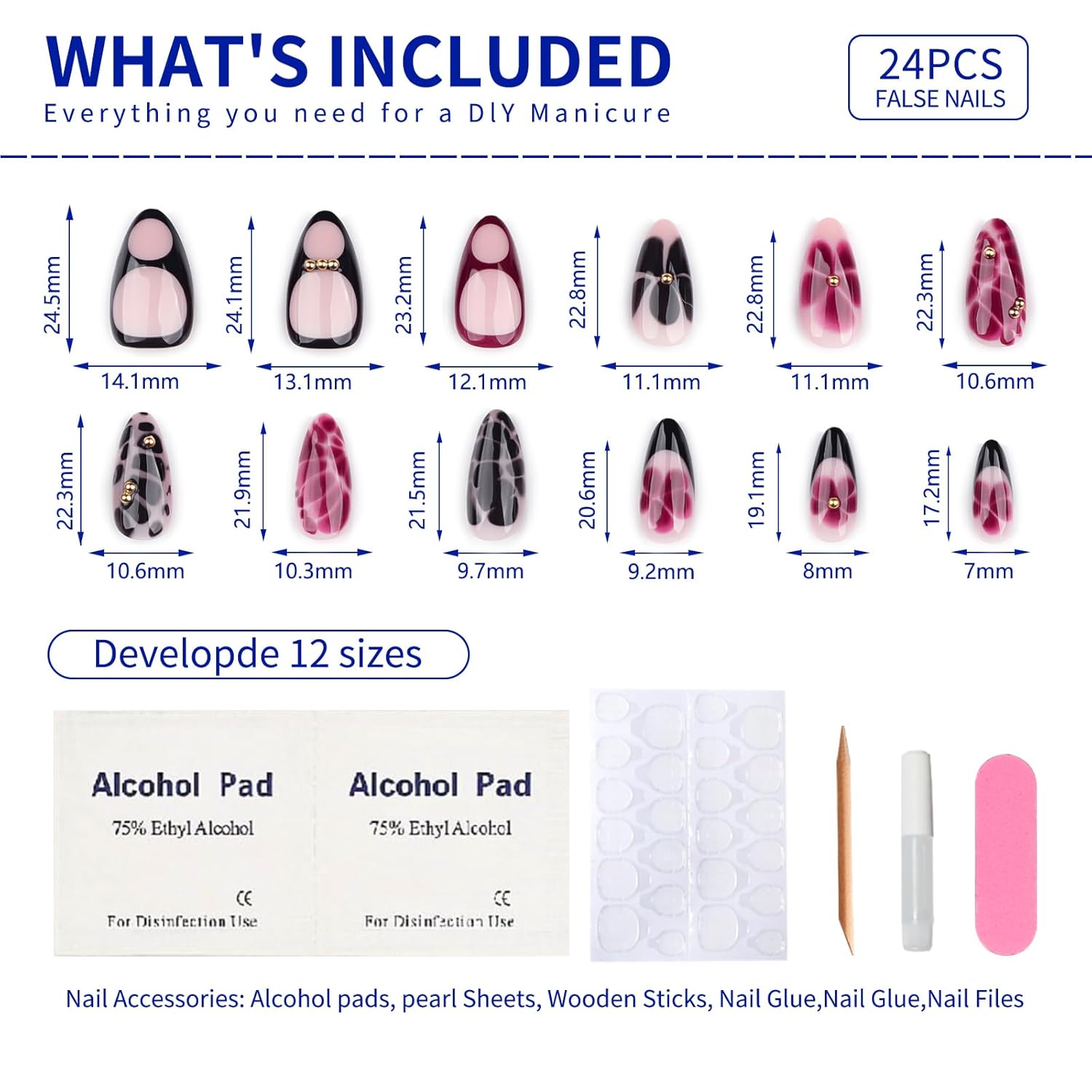 - Summer press on nails: Black and Burgundy Petal Accents french press on nails short give you infinite opportunity to play around with different trendy nail styles for every mood, every outfit, and everyday