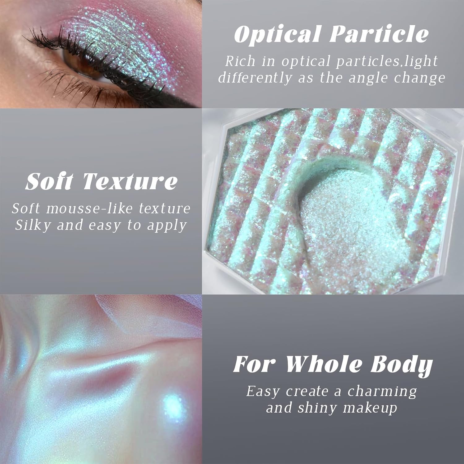 Chameleon Mermaid White Glitter Eyeshadow, Cream to Powder Shimmer Multichrome Single Eyeshadow, Sparkling Holographic Color Shifting Eye Brightener Highlighter Makeup Palette 01