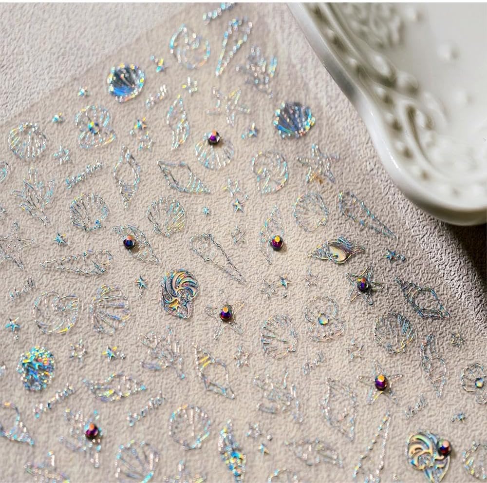 Aurora Ocean Nail Stickers Pearl Shell Conch Nail Designs Starfish Nail Decals 5D Embossed Silver Star Beach 3D Self-Adhesive Summer Nail Art Decoration for Women DIY Manicure 2 Sheets