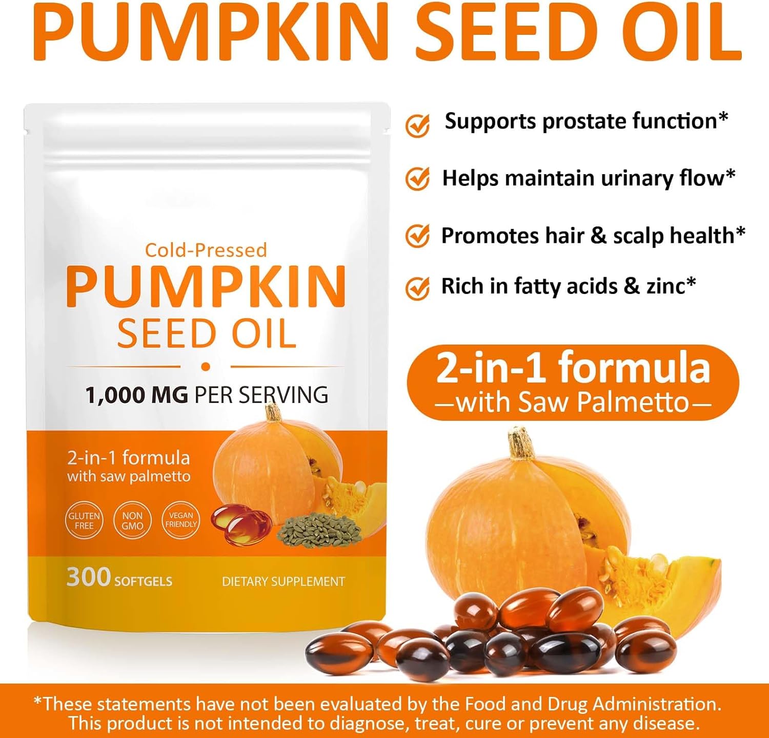 - Pumpkin Seed Oil Supplement Capsules: Pumpkin Seed Oil Capsules offers max strength virgin pumpkin seed oil softgels, high concentrated cold-pressed ingredients,use a cold-pressed extraction,2-in-1 complex with saw palmetto extract, retains essential fatty acids retain all the natural benefits of pumpkin seed oil, ensuring you get a high-quality, nutrient-rich supplement