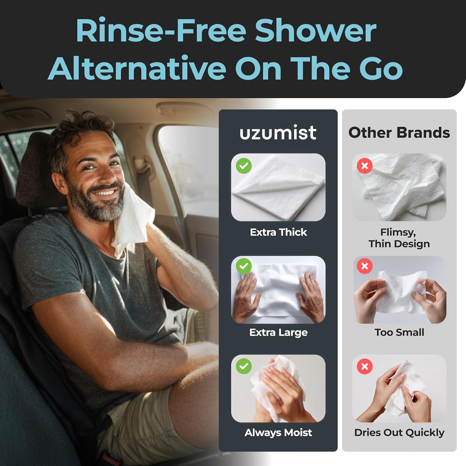 - Made with 100% Bamboo Fibers, Plant-Based Yet Ultra Gentle. These compact travel-size camping shower wipes are non-abrasive and ready for quick refreshes while hiking, camping, traveling or attending festivals. Perfect for outdoor adventures and minimal packing, these bathing wipes for adults rinse free are a trusted camping hygiene essential. Add to Cart and Order Now for clean comfort wherever you are.