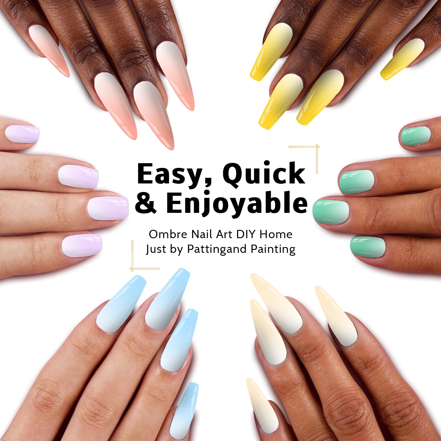 - 【EASY USE:】All steps are the same as normal UV/LED nail gel: 1.Clean and Prep; 2. Base coat and cure. 3. Apply color gel and cure. 4. Top coat and cure. 5. Clean nails and apply oil. Karroy ombre painting nail gel is easy to use: just grabbing a sponge and picking up your desire color, and patting sponge on your nail, you will get wonderful gradient coloring nails!