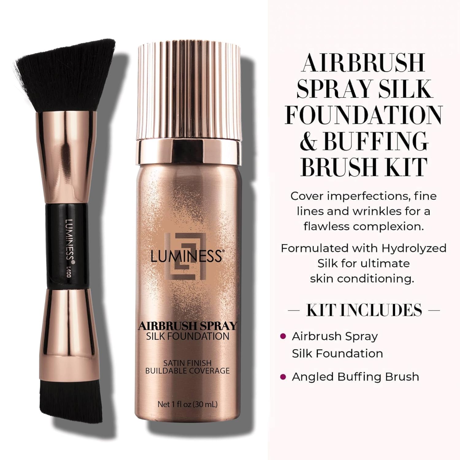 LUMINESS Silk Airbrush Spray Foundation 2-PC Kit - Foundation & Dual-Sided Angled Makeup Brush - Buildable Coverage, Anti-Aging Formula, Humidity Resistant, Hydrates & Moisturizes, Warm