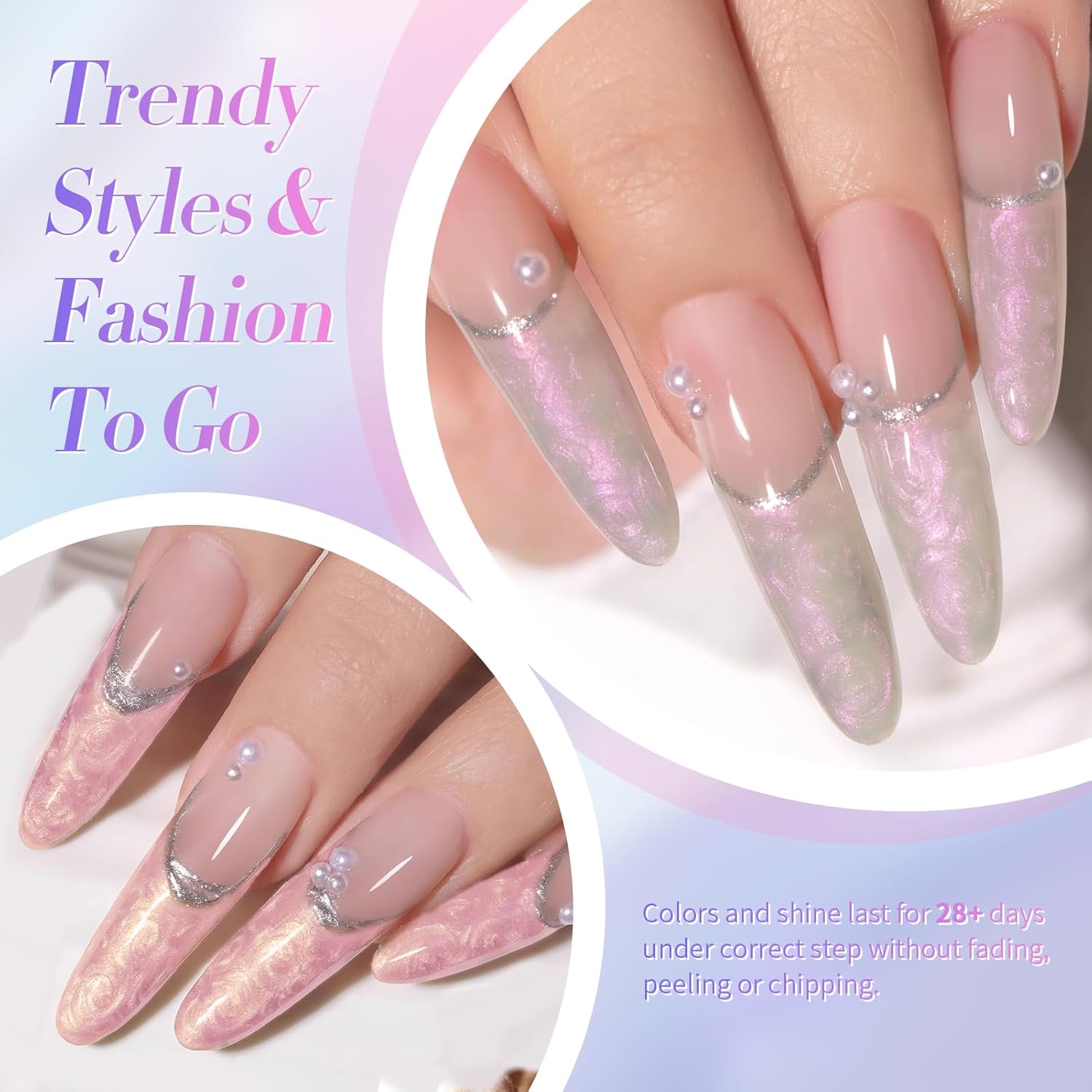 - [Pearl Mermaid and Swirl Thread Gel Polish Set]: This is 2-in-1 gel nail polish, it will get Swirl Shell Thread effect after you using the dotting pen(not include), and it is pearl mermaid effect without using the tool