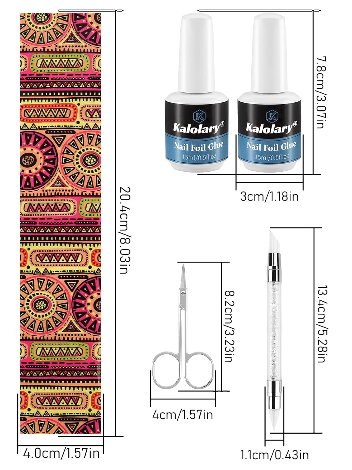 - NAIL ART FOIL STICKERS SET - 80 Pcs nail foil transfer sticker + 2×15ML nail glue + 1×nail press pen + 1×sticker scissors. 80 unique foil designs for you to reate countless eye-catching nail patterns.