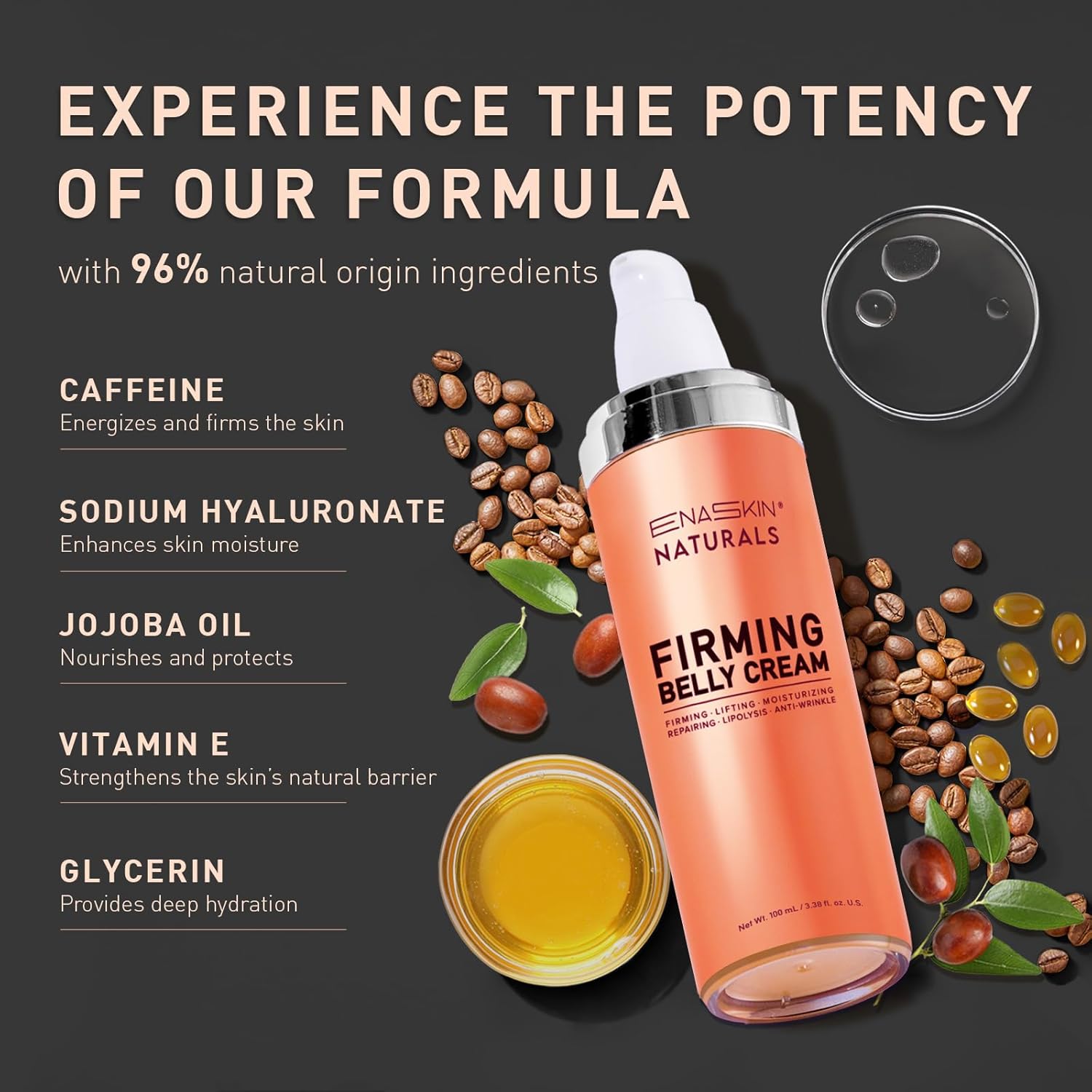 - NOURISH AND ENERGIZE YOUR SKIN: Infused with skin-loving ingredients, our Belly Firming Cream combines the warming power of Vanillyl Butyl Ether to gently stimulate and revitalize, Vitamin E to protect with antioxidants, Jojoba Oil to moisturize and soften, and Sodium Hyaluronate to deeply hydrate and plump the skin.