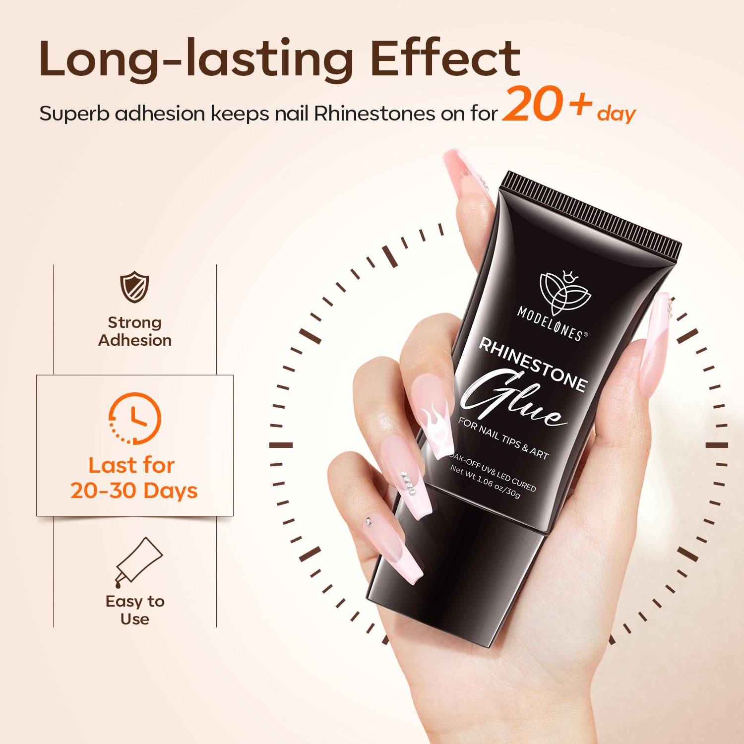 - Easy to Use: Are you still confused with the inconvenient access to traditional adhesive nail glue and poor control of the amount? Modelones rhinestones glue is in a soft tube &tip design which enables you to squeeze out the nail art gel glue as you need and keeps uniform every time you use it, with no mess, spill, or waste