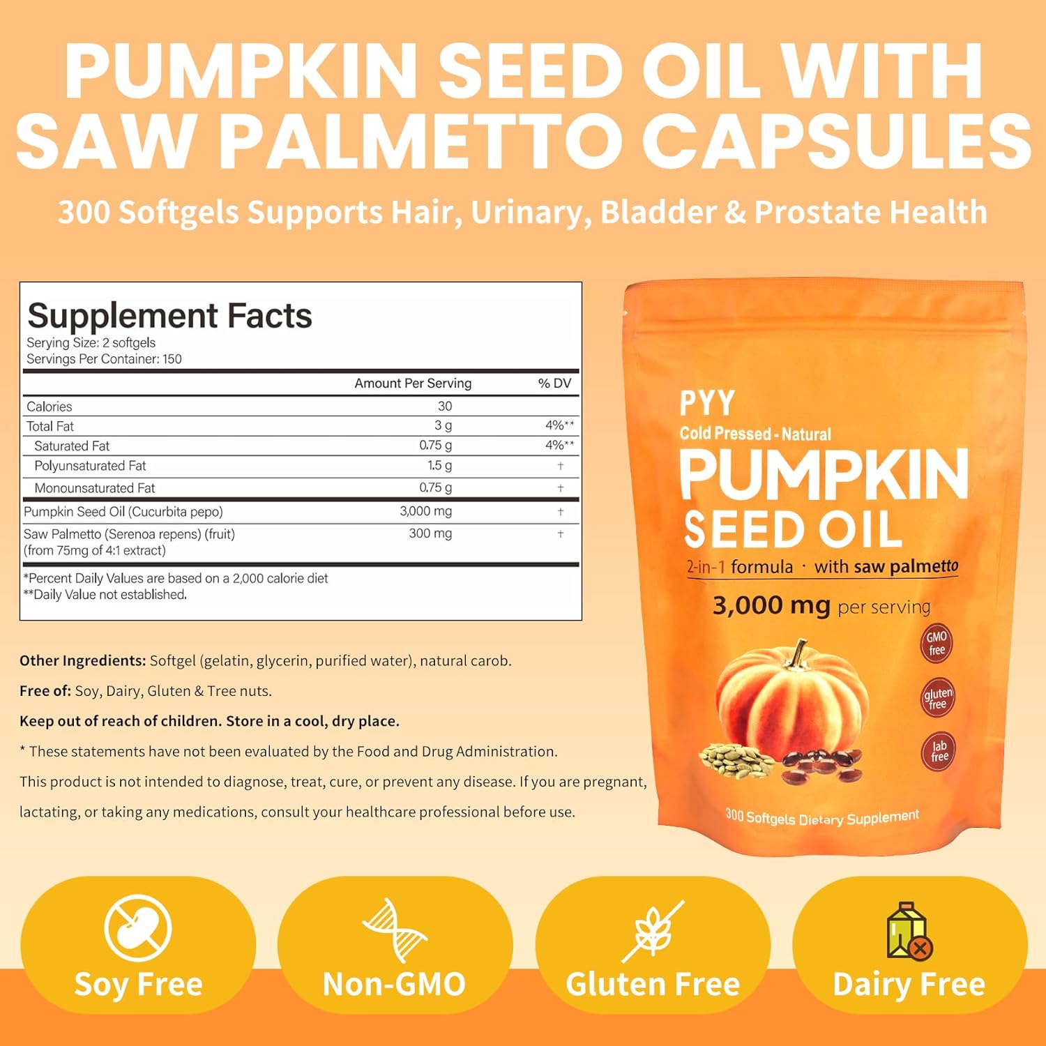 PYY Cold-Pressed Pumpkin Seed Oil & Saw Palmetto Softgels | 300 Count | Rich in Essential Fatty Acids & Phytosterols | Promotes Healthy Hair, Urinary Function, Bladder & Prostate Support