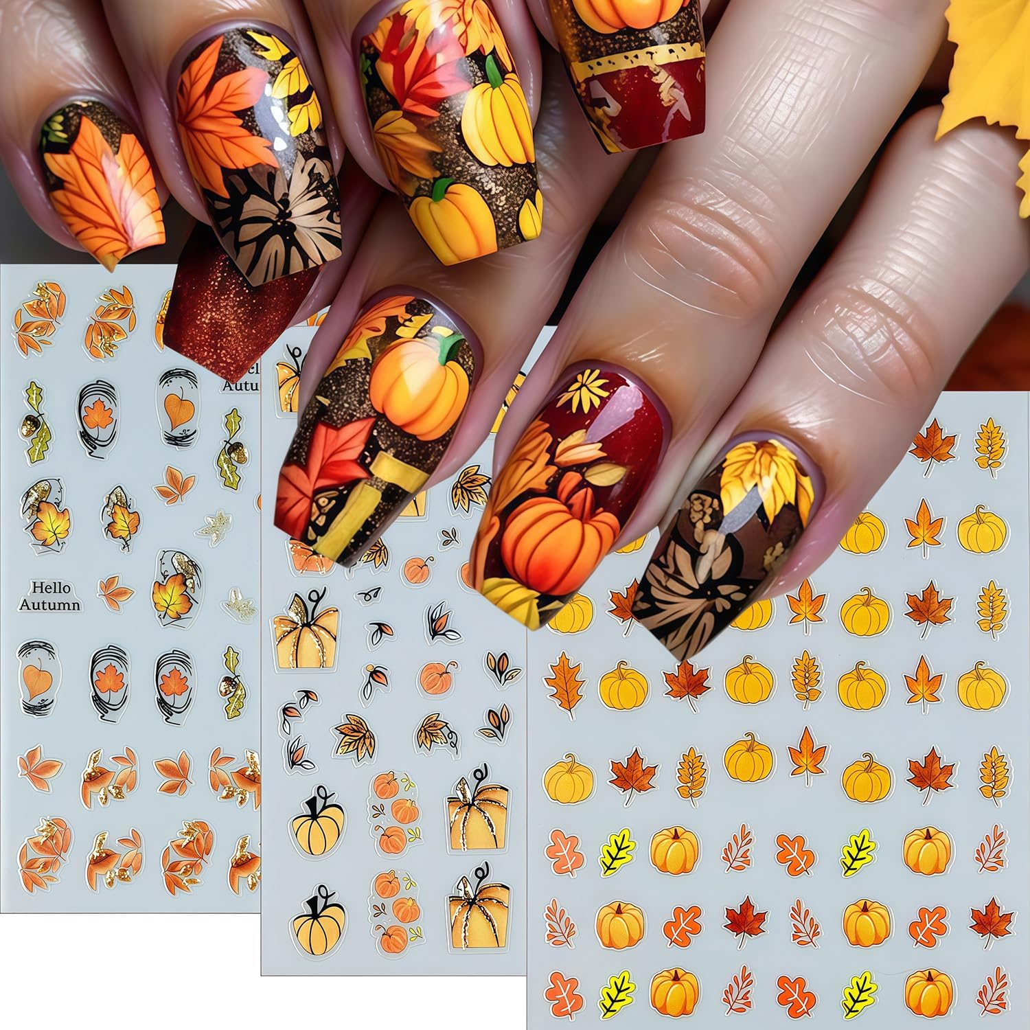 - Quantity: You will get 6 sheets of fall maple leaves nail art stickers, including cute maple leaves and pumpkin,leaf designs, not easy to fall off or fade, can easily create a variety of themed nail art, meet various nail art needs