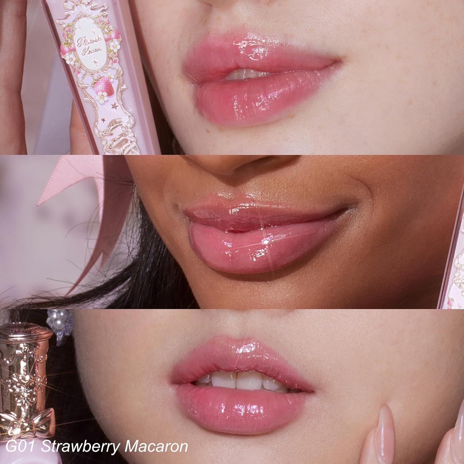 - 3-Piece Lip Gloss Set: Get the must-have shades in one gorgeous set! Includes G01 (a soft, shimmer-free baby pink), G02 (a sparkling hot pink with delicate shimmer), and G03 (a translucent pink with a hint of glitter). Plus, receive an exclusive matching hair clip and a stylish canvas tote bag as free gifts—perfect for completing your dreamy, romantic look
