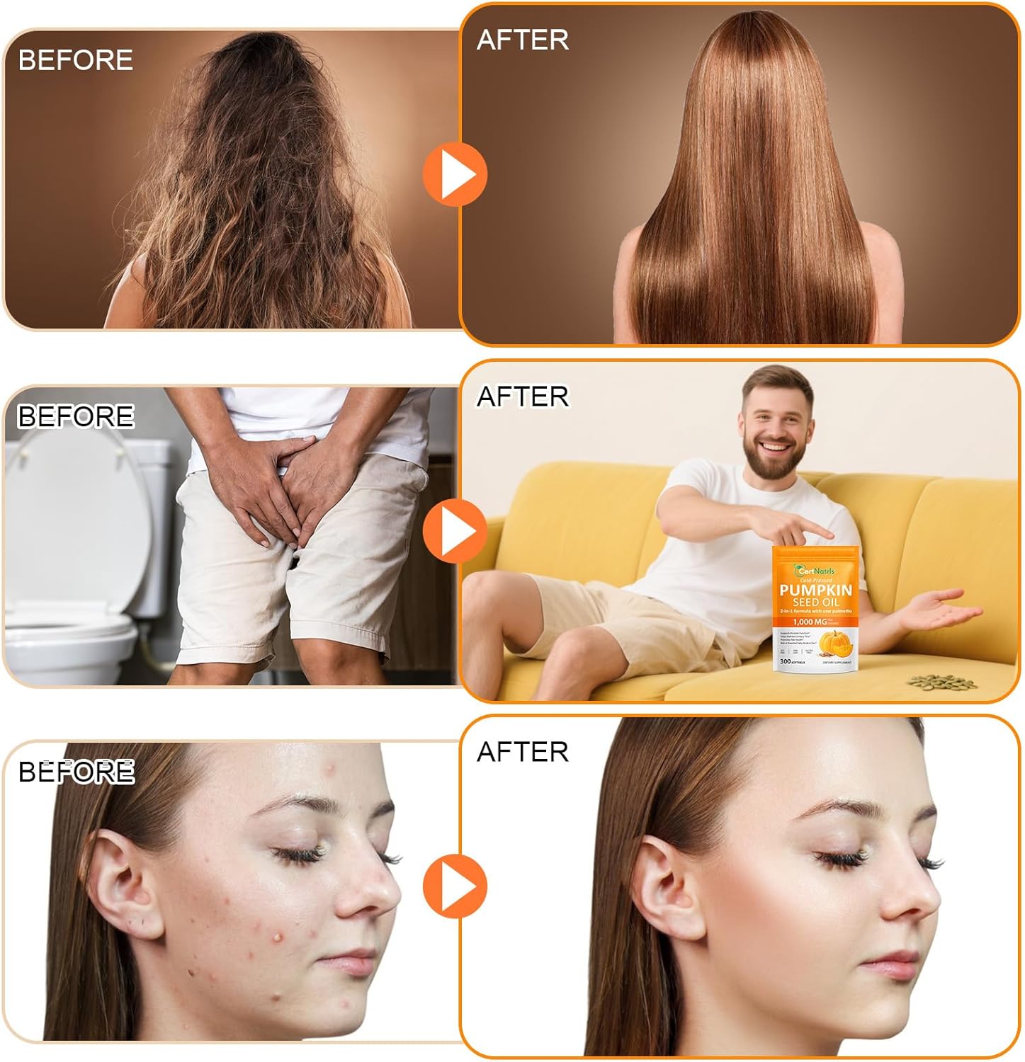 - Tailored for Both Men & Women: Taking pumpkin seed oil with saw palmetto capsules daily offers dual action support for prostate, bladder, urinary, and hair health for both men and women. The high vitamin E and antioxidant, it helps maintain youthful, hydrated skin by fighting free radicals and supporting collagen production