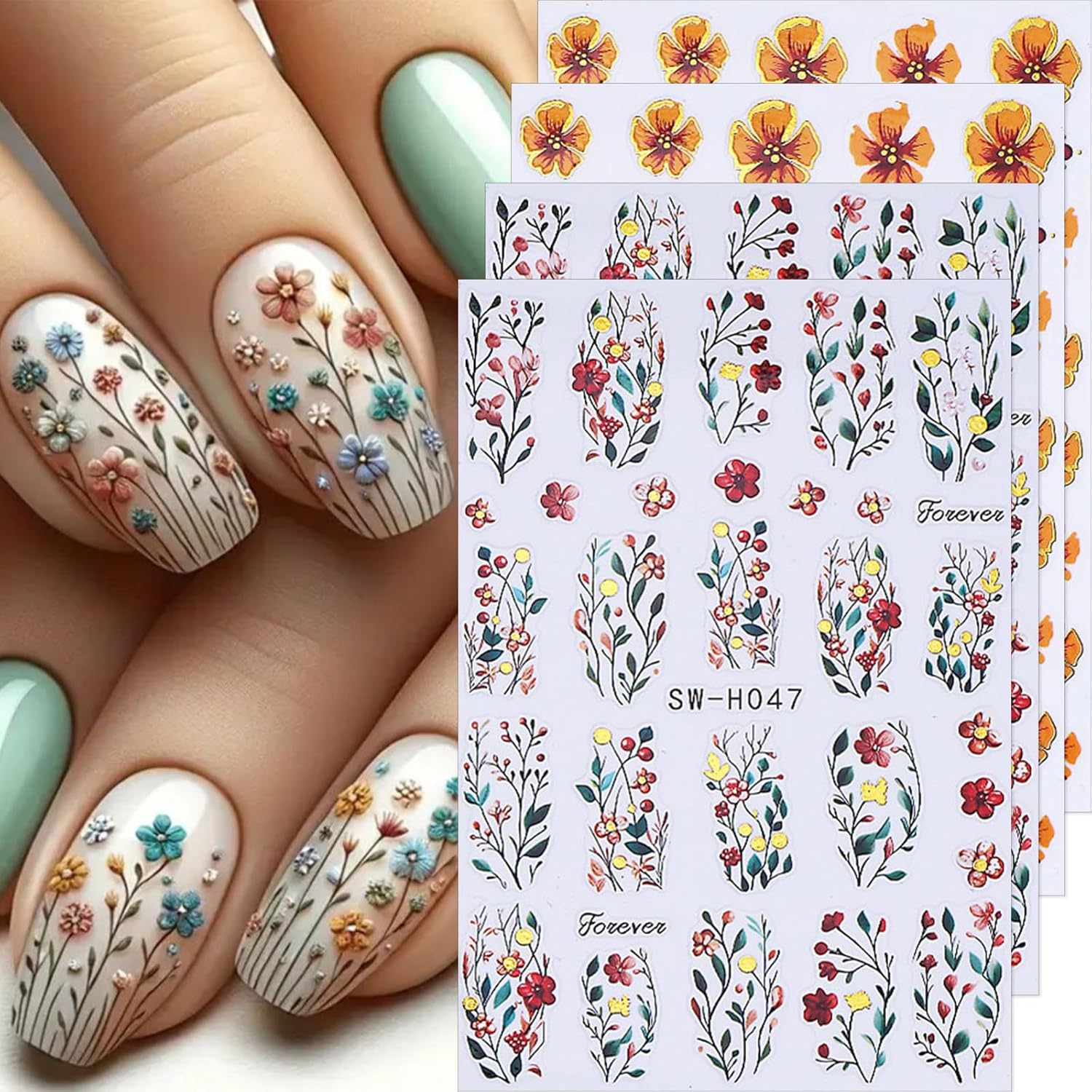 Fall Flower Nail Stickers Cute Nail Decals 3D Self Adhesive Floral Nails Design Supplies Autumn Nail Charms Slider Manicure Accessories Flowers Nail Art Stickers for Women Nail Art Decorations 4PCS