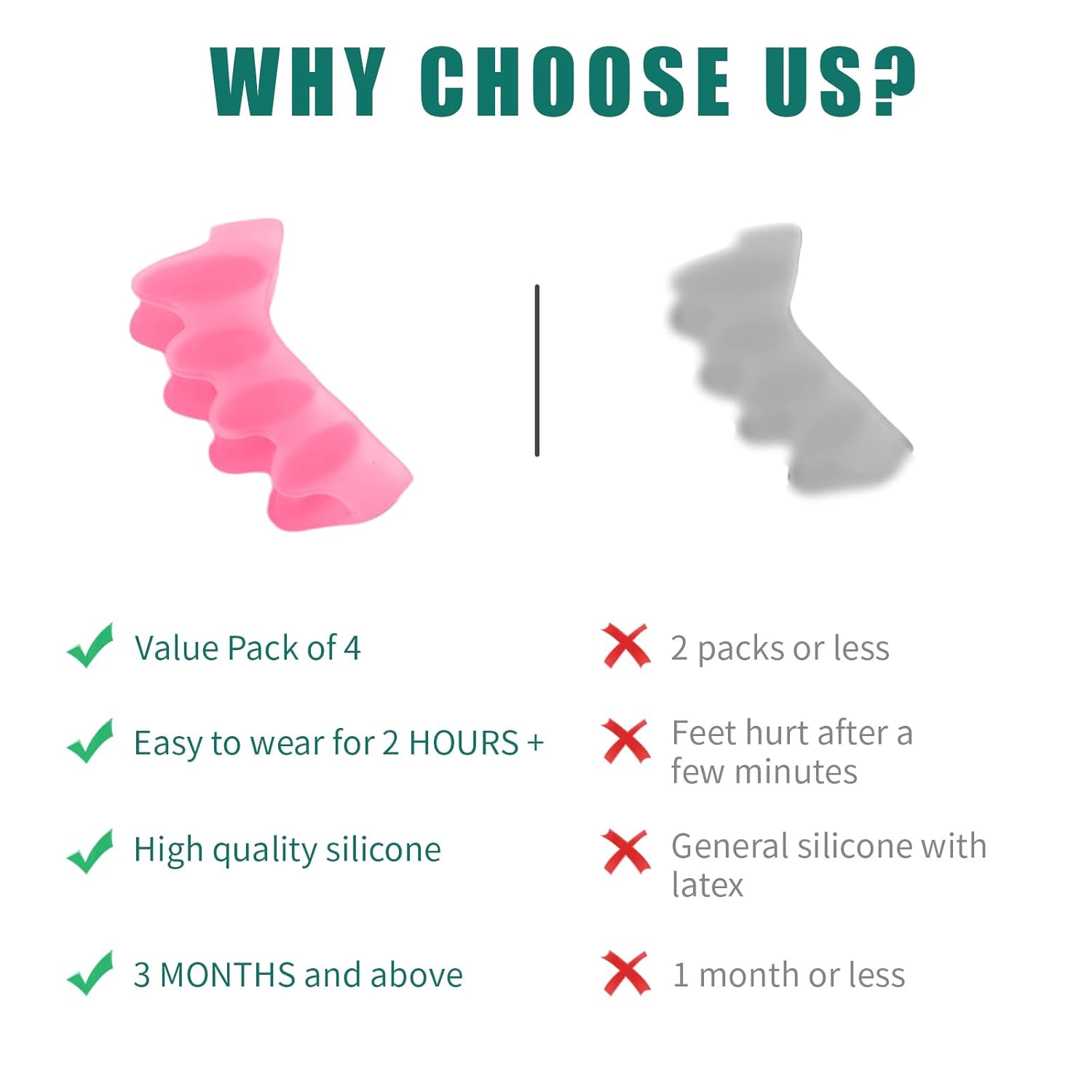 - 👣High-Quality Silicone: Toe spacers Crafted from premium, flexible silicone that is soft, stretchy, and durable, ensuring long-lasting use. It offers excellent stability, high elasticity, and resists compression without deformation, providing maximum comfort during use and easy cleaning.